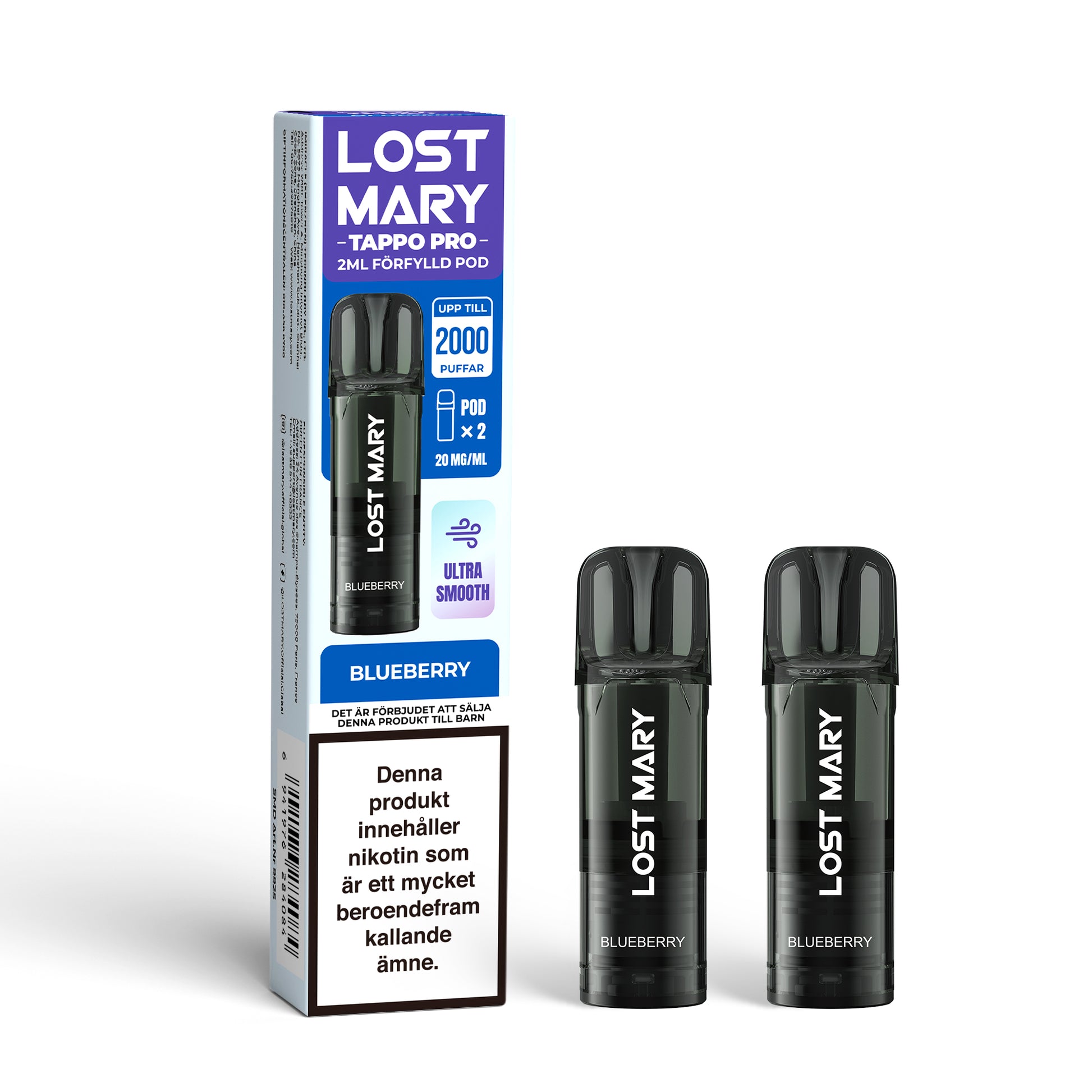Lost Mary TAPPO PRO Pod x2 Blueberry 20mg är en produkt där du får två poddar som du använder till Lost Mary TAPPO Device + PRO Pod. Produkten erbjuder upp till 2000 puffar beroende på användning och du ser enkelt när den börjar ta slut då vätskan ligger synligt i podden. En pod innehåller 2ml e-vätska med 20mg nikotinstyrka.