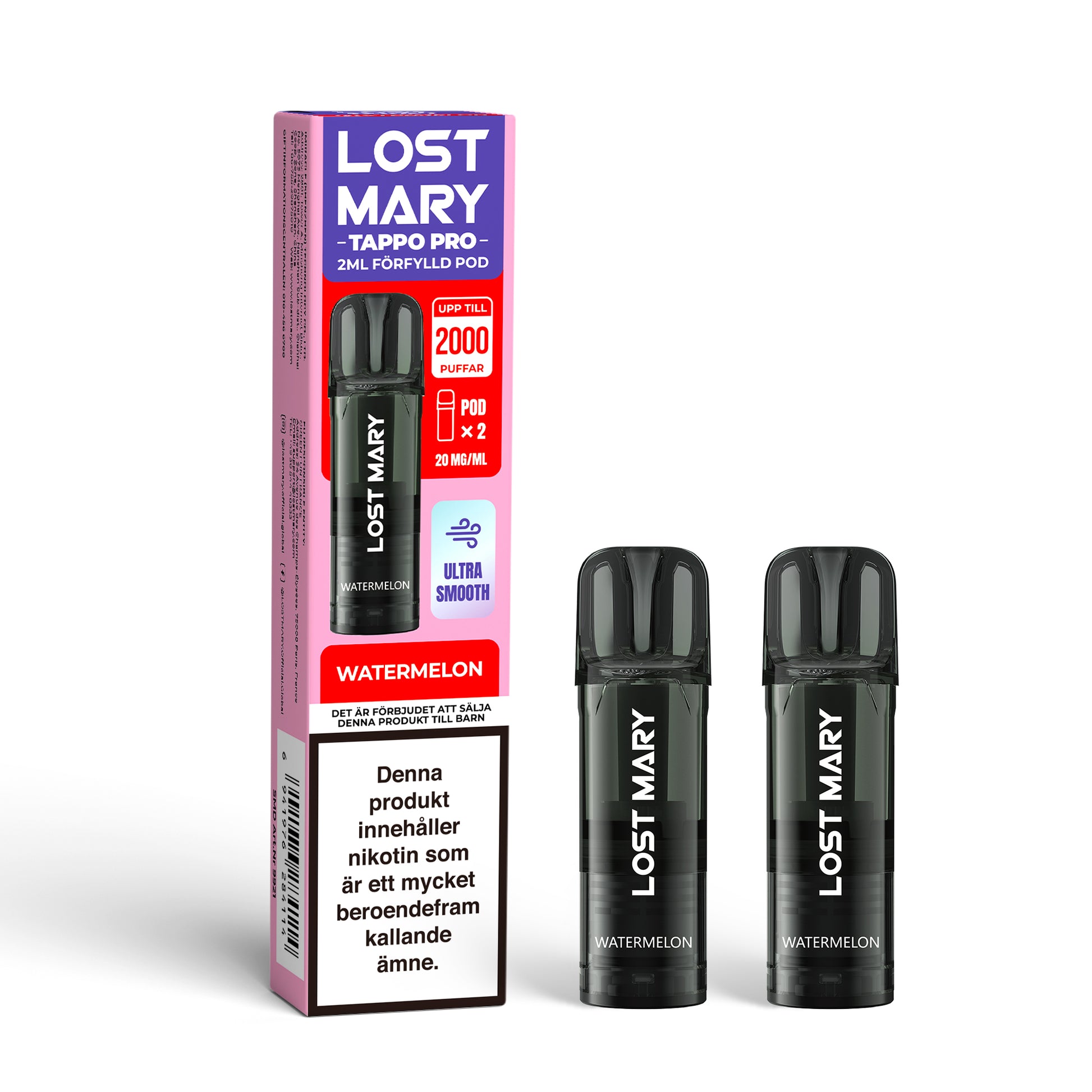 Lost Mary TAPPO PRO Pod x2 Watermelon 20mg är en produkt där du får två poddar som du använder till Lost Mary TAPPO Device + PRO Pod. Produkten erbjuder upp till 2000 puffar beroende på användning och du ser enkelt när den börjar ta slut då vätskan ligger synligt i podden. En pod innehåller 2ml e-vätska med 20mg nikotinstyrka.